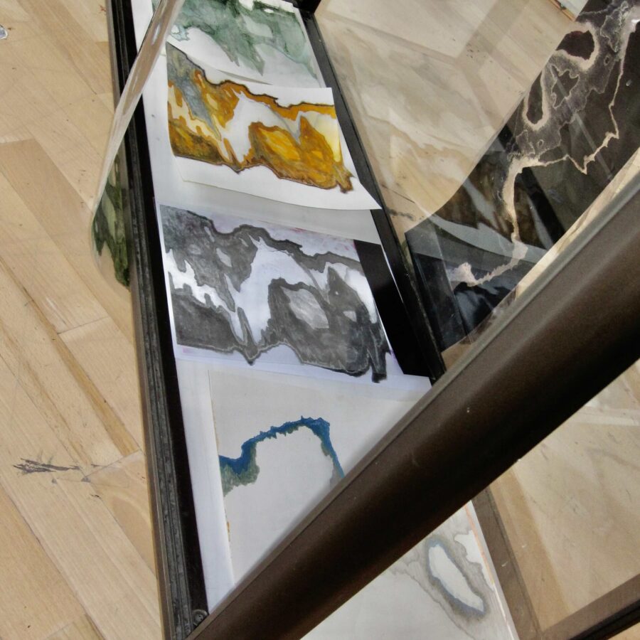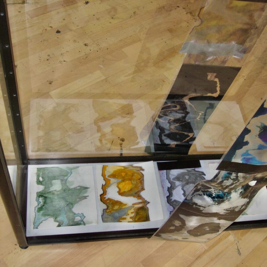 multi media installation („film wheel“, colour lights, beamer, sound system, wooden sticks, „pigment paper“, foil, aquariums, sand, algae, aluminum wire)